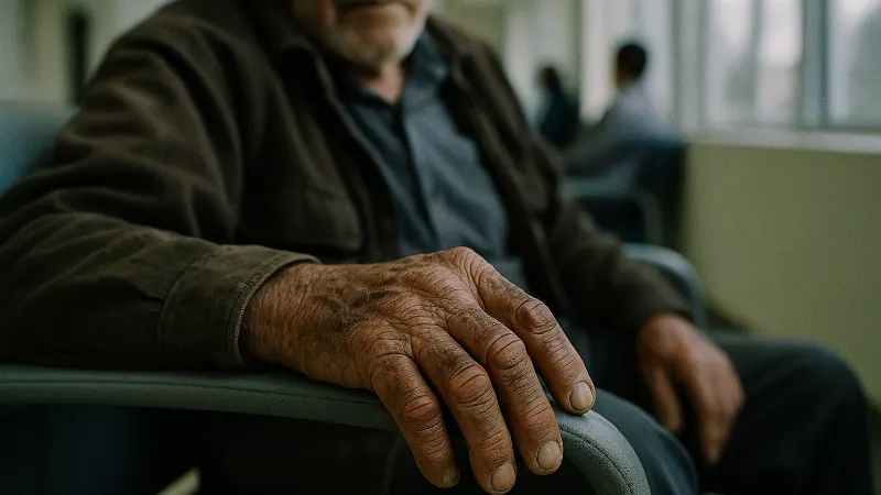 !Elderly man's weathered hands on waiting room chair armrest in cancer treatment center