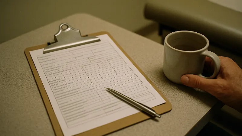 !Hospital exam room desk with medical clipboard, pen, and coffee mug in clinical lighting